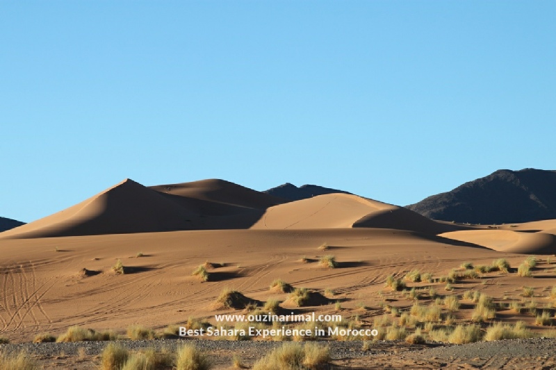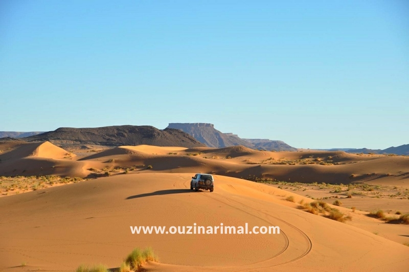 A midi nous mangeons une Pizza berbère délicieuse chez la famille qui tient l'auberge d'Ouzina Rimal, l'après midi nous prendrons une autre piste pour rentrer à l'auberge Ouzina Rimal en traversant un cordon de dunettes au pied de d'une montagne roche noire, nous profitons de l'admiration de coucher du soleil magique sur les grandes dunes enfin nous arriverons à l'auberge soirée musicale au rythme de Tamtam et djembe.