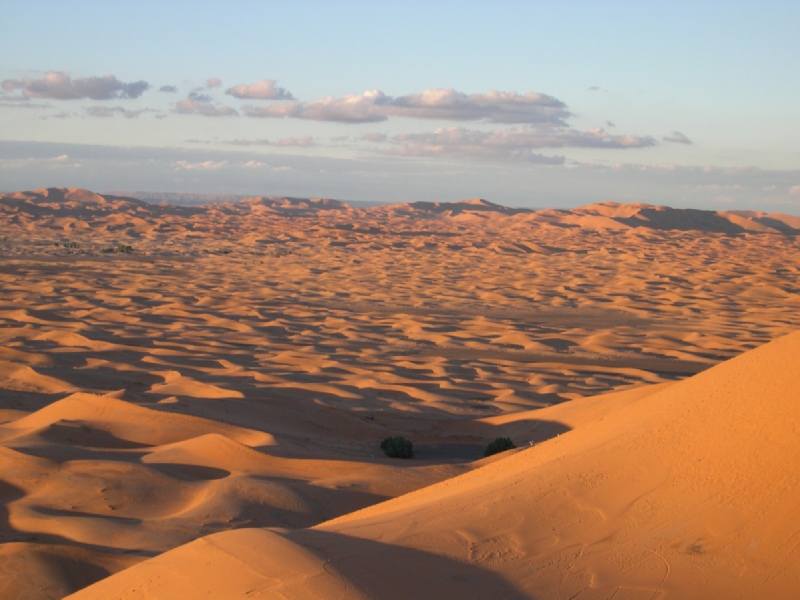 Réveil matinal pour assister au lever du soleil aux sommet des dunes ocres d'Ouzina , départ vers le Sud des premiers contreforts du Sahara et rencontre avec les nomades du désert avec leur troupeau de chèvres et dromadaires. On découvrira le fonctionnement de la vie dans le désert avec des pauses dans les villages sahariens et dans des petites auberges pour y déguster le véritable thé à la menthe…