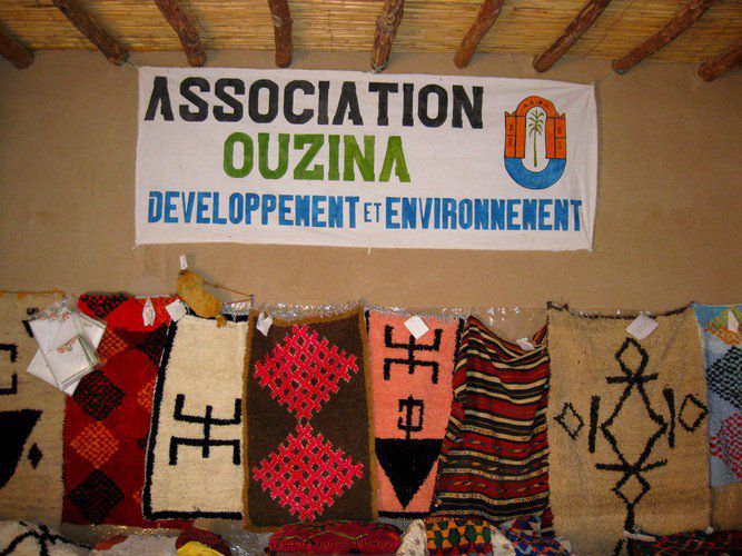 Après avoir pris un petit déjeuner complet tranquillement sur la terrasse de l'auberge qui donne une belle vue sur les dunes ocres. Nous partirons par la piste de Dakar vers l'Est en direction village Ouzina, nous visiterons des installations humanitaires faite par l’association Ouzina pour le développement et l'environnement au village d’Ouzina nous partageons un thé à la menthe , rencontre avec la population locale ensuite visite d' un atelier féminin où les femmes du village fabriquent de jolis tapis aux motifs et signes berbères, ensuite nous continuons la découverte du village en visitons les jardins de palmeraie et les ruines d'une vielle Kasbah.