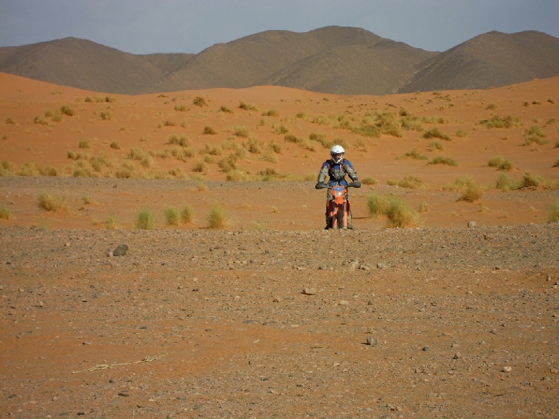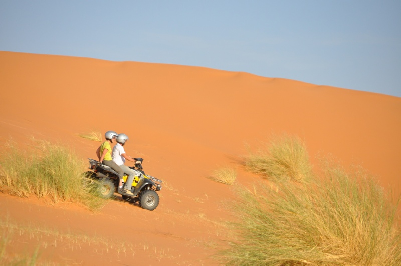 A midi nous mangeons une Pizza berbère délicieuse chez la famille qui tient l'auberge d'Ouzina Rimal, l'après midi nous prendrons une autre piste pour rentrer à l'auberge Ouzina Rimal en traversant un cordon de dunettes au pied de d'une montagne roche noire, nous profitons de l'admiration de coucher du soleil magique sur les grandes dunes enfin nous arriverons à l'auberge soirée musicale au rythme de Tamtam et djembe.