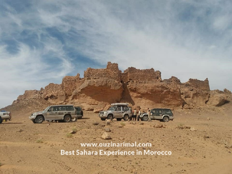 Nous visitons aussi le filon 12, et des mines de plomb, de vanadinite, de barytine, puis visite de la citée antique d'Ouafilal, après nous partons plein Est vers village Begaa, nous visiterons une couche du Jurassique (les os et les dents fossilisés de certains animaux), nous mangerons notre panier pique nique dans une oasis, En fin d'après midi retour à l’auberge OUZINA RIMAL par la piste de Dakar, soirée musicale .